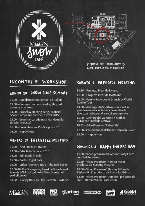 17.00-18.30 – Snowpark, Freeski e Snowboard Awards 2014. L’attenzione si sposta nel padiglione A sul palco dei Main Events per le attese premiazioni degli awards 2014 realizzati da MOON per assegnare gli oscar 2014 di Snowpark, Freeski e Snowboard.