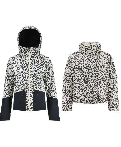 La giacca da sci Rochrun Allover Print Ski Jacket (a sinistra) offre prestazioni tecniche e decisamente all’avanguardia, combinando l’isolamento traspirante PrimaLoft® Black (riciclato al 100% e proveniente da bottiglie di plastica post-consumo) a una membrana impermeabile PFC-Free (senza l’utilizzo di sostanze nocive) e altamente traspirante in grado di garantire comfort e calore anche nelle giornate più fredde. Allo stesso modo, anche il modello Aretu Allover Print Down Jacket (a destra) unisce il calore naturale dell’imbottitura in piuma certificata RDS (nel rispetto del benessere animale) a una silhouette slim e femminile, assicurando protezione ottimale nelle giornate più rigide.