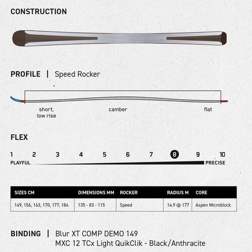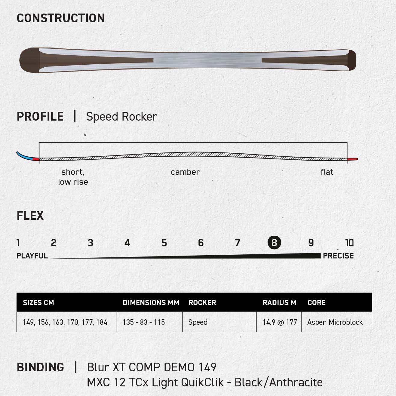 Particolare la costruzione di Blur XT con il Titanal che ricopre la sagoma dello sci nella posizione centrale sotto il piede, mentre in prossimità della punta e della coda il rinforzo in titanal si divide in due parti, seguendo la sciancratura dello sci vicino alle lamine. Una scelta nata dall'obiettivo di mantenere lo sci leggero, favorendo al contempo il carving e la maneggevolezza.