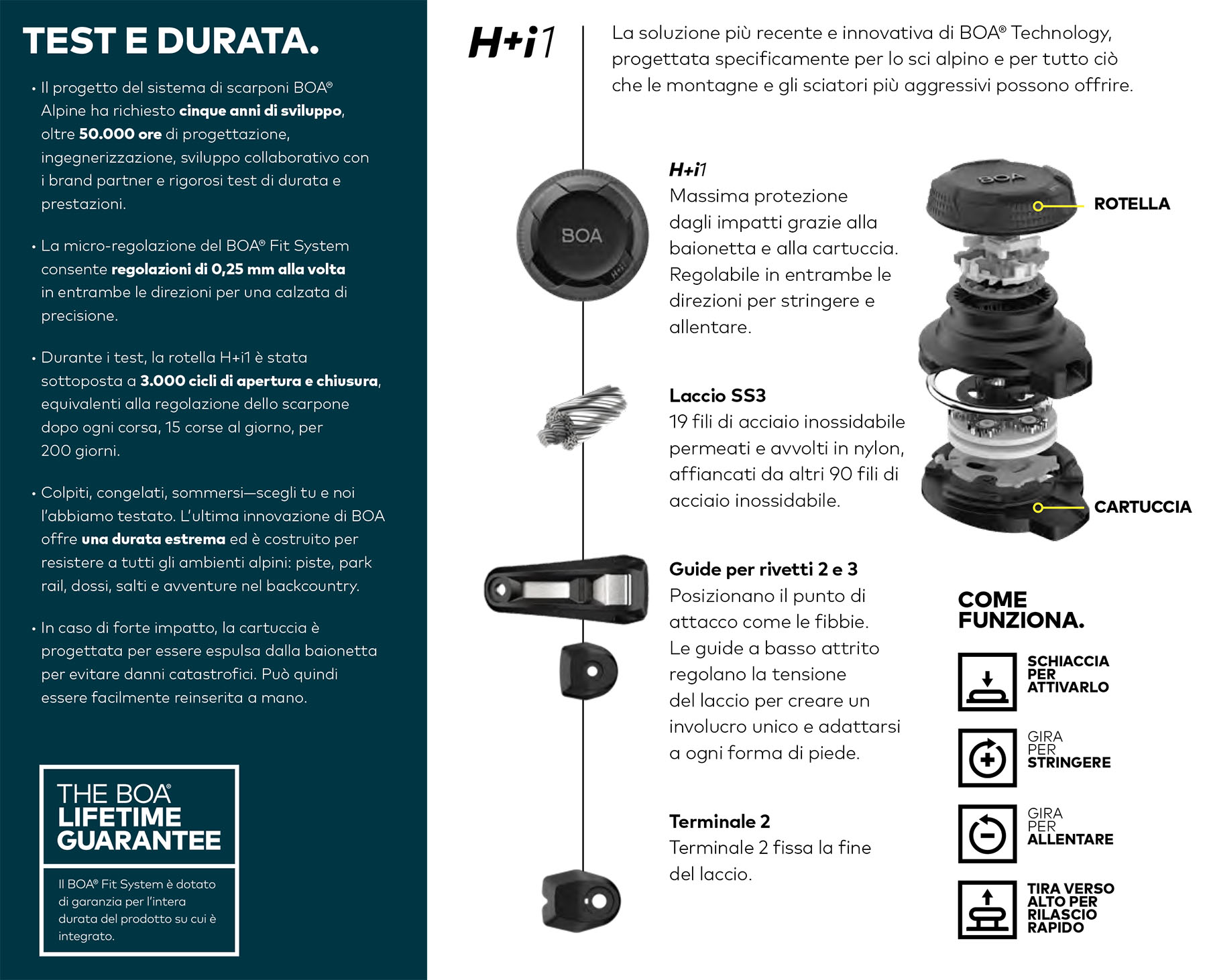 Inoltre, in parallelo abbiamo effettuato studi di implementazione sugli scarponi, sviluppato nuove configurazioni e lo scorso anno abbiamo pubblicato uno studio di validazione biomeccanica su Frontier in Sports, dove esponiamo i vantaggi che BOA® porta in termini di prestazioni: una migliore distribuzione della pressione sul dorso del piede con una riduzione del 13% del picco di pressione, pur garantendo una calzata precisa e uniforme, combinato ad un miglioramento della risposta e del trasferimento di potenza durante le curve, con aumento fino al 6% delle forze di picco sotto il piede ed un miglioramento del 10% di forza trasferita all'inizio della curva.