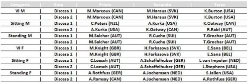 Le poco clementi condizioni meteo per domani hanno costretto gli organizzatori della tappa di Coppa del Mondo di Sci Alpino IPC dedicata alle prove veloci a far disputare entrambe le Discese in programma nella giornata di oggi. Bertagnolli quarto nel secondo impegno, doppio podio per il nipote di Didier Cuche.