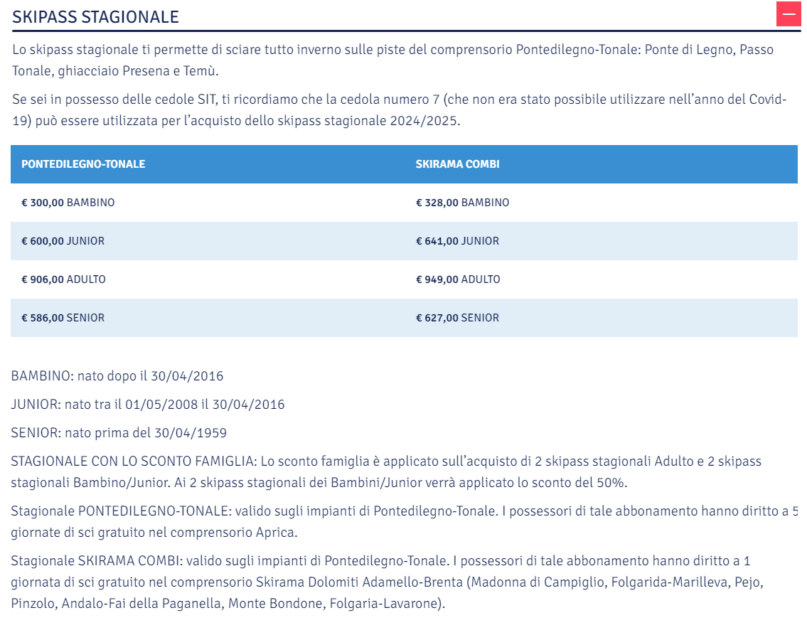 Skipass Passo del Tonale, Ponte di Legno, stagionale