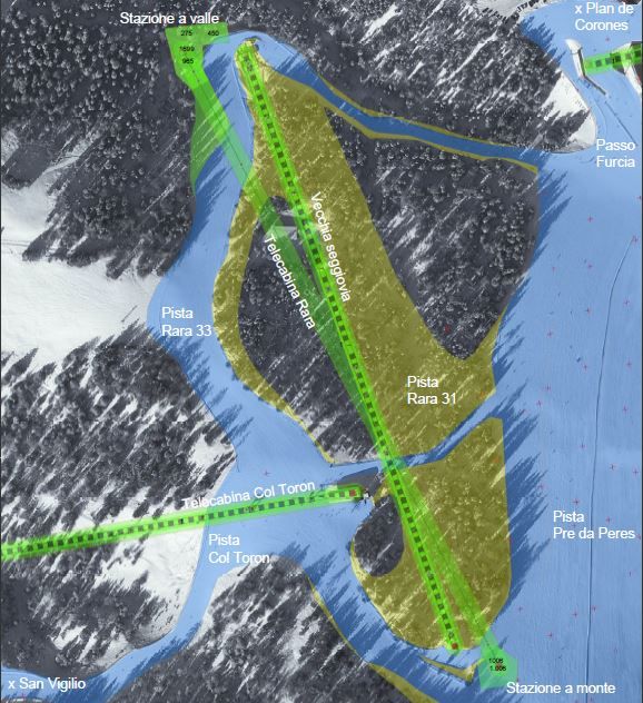 Contemporaneamente il progetto prevede anche un notevole ampliamento delle piste esistenti, con un nuovo tratto di pista che dovrebbe migliorare tutta la situazione della zona sciabile tra il Col Toron ed il Passo Furcia.