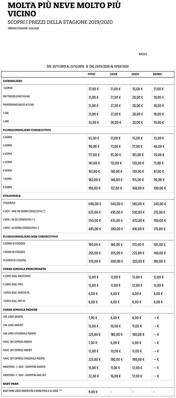 Skipass Madesimo Valchiavenna 2019/2020 Bassa Stagione