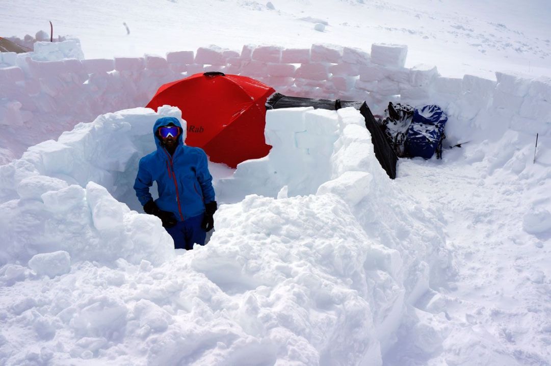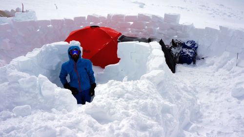 I primi tre giorni il tempo è clemente e si sale relativamente poco. Le slitte si portano con facilità. Ai campi i ragazzi della spedizione prendono confidenza con la costruzione di cucine in ghiaccio. Si tagliano con la sega grossi mattoni di ghiaccio e via a fare muretti, ripiani e ripari esattamente come gli eschimesi fanno con gli igloo.