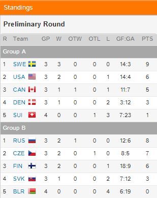Con la seconda vittoria nel torneo gli Stati Uniti sono provvisoriamente al secondo posto nel girone dietro la outsider Svezia che pur continuando a subire l'assenza della sua stella William Nylander avanza come un tritasassi guidata dal fratellino Alexander. A farne le spese, nella terza vittoria consecutiva, è la Danimarca superata con il punteggio di 5-0 in una partita dove la tremenda superiorità difensiva dei gialloblu ha concesso agli avversari solo 9 tiri in 60 minuti.