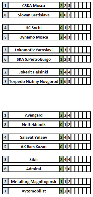 La situazione appare più favorevole alle migliori classificate della stagione regolare con tre 2-0 su quattro sfide. Rischia di uscire il runner-up dello scorso anno, l'AK Bars Kazan che in due partite a Ufa contro il Salavat Yulaev ha incassato 9 reti andando a segno solo 3 volte. I due impegni casalinghi di gara 3 e 4 sono l'ultima chiamata.