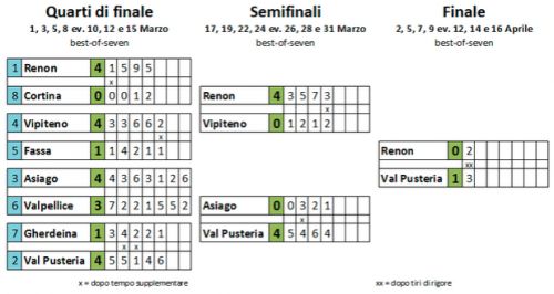 Ricco di emozioni l'overtime quando al 74' gli arbitri impiegano cinque minuti per interpretare all'instant replay una parata di Weiman su tiro di Cook. Dentro o fuori, alla fine gli arbitri decidono per la parata del goalie dei Lupi che manda tutti ai tiri di rigore. Si va ad oltranza ed è Hofer a segnare mentre Van Guilder sbaglia. Il primo round va al Val Pusteria che martedì ospiterà per gara 2 la Rittner Buam.