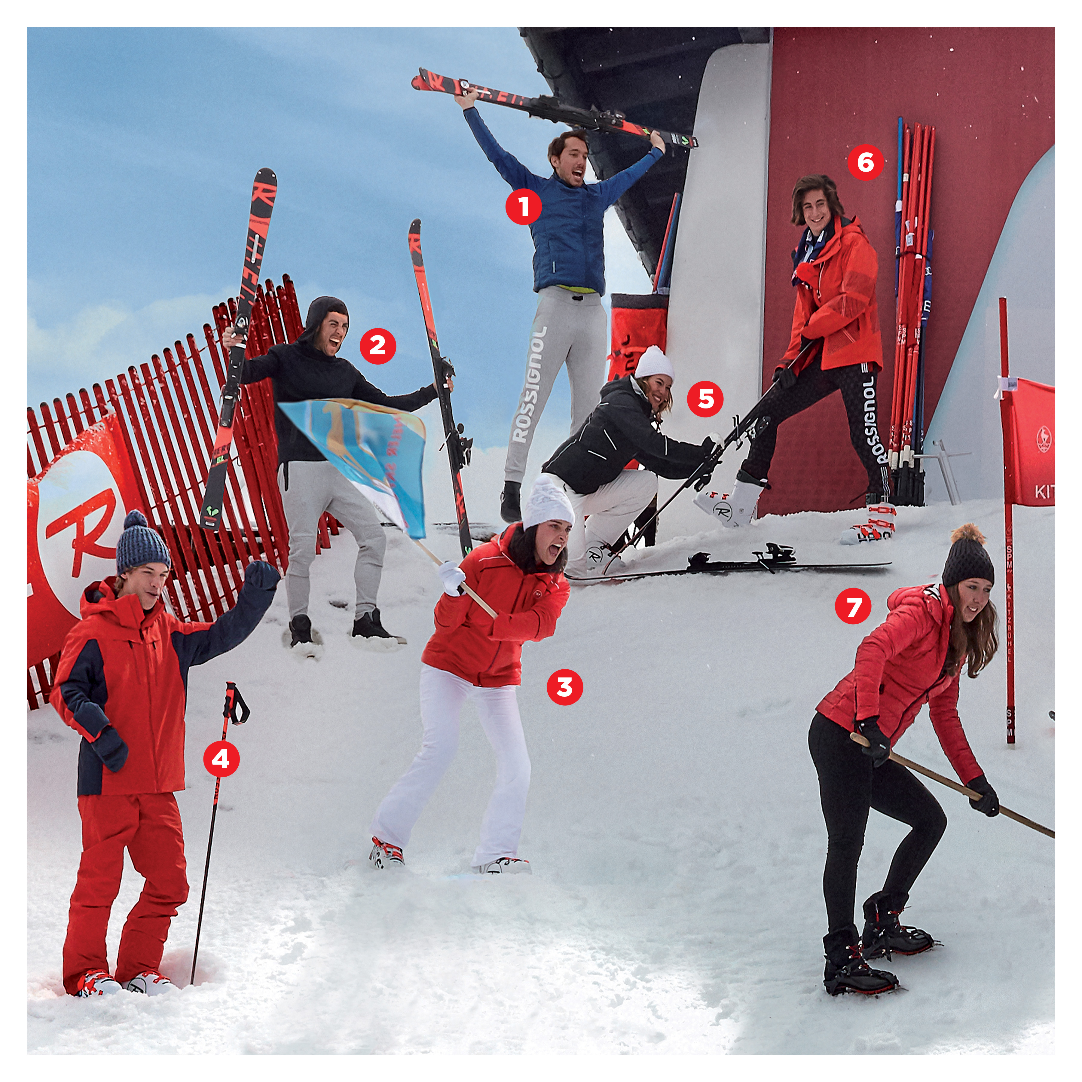 Sotto lo sguardo attento dell'esperto Carlo Janka (1), terzo classificato a Kitzbühel nel 2016, del campione del mondo di sci di fondo Federico Pellegrino (2), lo sciatore paralimpico Marie Bochet (3), titolare di 15 medaglie d'oro internazionali, e il canadese Alexis Guimond (4), medaglia di bronzo agli ultimi campionati del mondo, si uniscono al gruppo. Nel frattempo, Michelle Gisin (5), medaglia d'argento nella combinata di St Moritz nel 2017, aiuta il giovane sciatore di Serre-Chevalier Louis Luftman (6) a fare le lamine agli sci mentre Kira Weidle (7), terzo nella discesa al Junior World Championships, sta preparando la pista per il prossimo atleta.