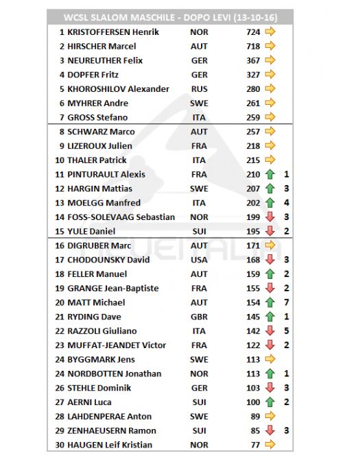 Manfred Moelgg, infatti, risale di quattro posizioni dal diciassettesimo al tredicesimo posto scavalcando Marc Digruber, Daniel Yule, Sebastian Foss-Solevaag e lo statunitense David Chodounsky che esce dal primo gruppo di merito. Si tratta del secondo miglioramento in assoluto provocato dalla giornata di ieri tra i primi trenta dove il solo Michael Matt, con la sua seconda piazza, ha fatto di meglio risalendo di cinque posizioni fino al ventesimo posto.