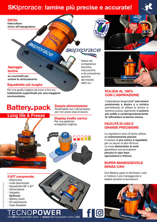 SKI Prorace è un innovativo affilalamine utile sia per chi si dedica allo sci agonistico, ma anche per chi, a livello amatoriale, vuole preparare personalmente in modo ottimale i propri attrezzi.