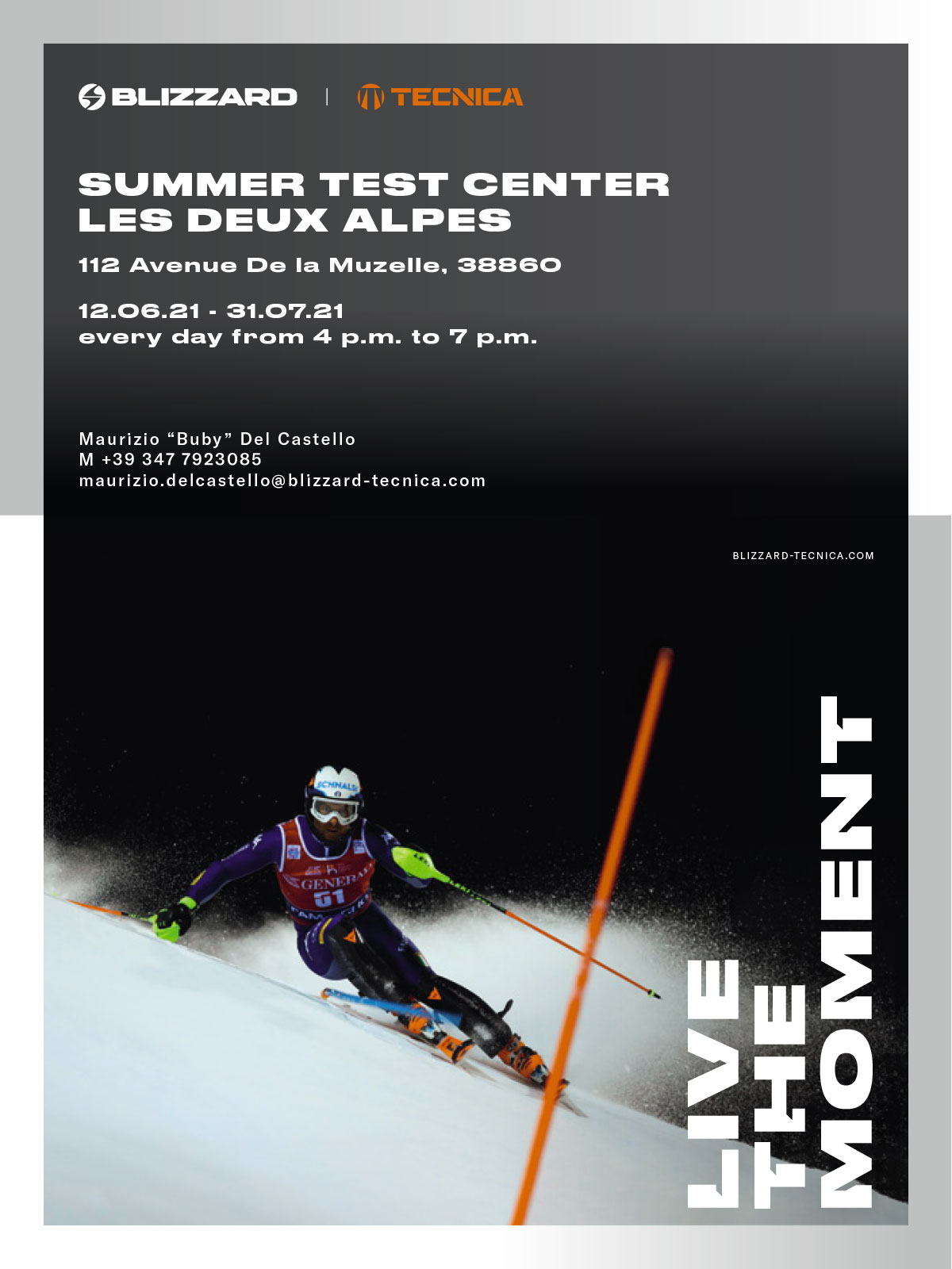 Sarà come di consueto Les Deux Alpes la base logistica del test racing Blizzard per l'estate 2021. Si potranno testare i Firebird della collezione 2021/2022 dal 12 giugno fino al 31 luglio, con l'irremovibile Maurizio "Buby" del Castello disponibile al Test Center di Avenue de la Muzelle, nel centro della località transalpina. Per informazioni potete contattare Buby al 347 7923085 oppure via mail a maurizio.delcastello#Blizzard-tecnica.com.