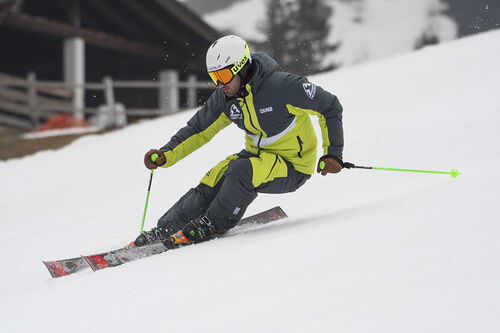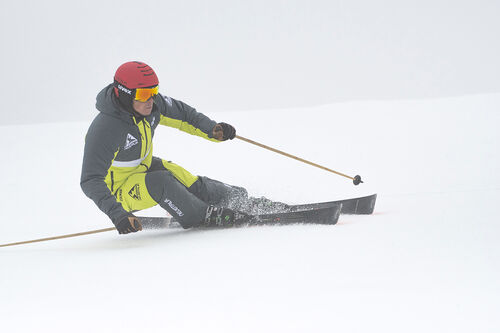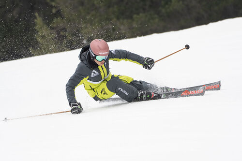 Testato in pista Mattasoglio lo trova leggermente più scomodo che nel test a secco e rileva un lieve fastidio nell’avampiede superiore a causa del collo del piede medio-alto, lo consiglia a chi ha il collo sottile. Bertolini conferma la sensazione a secco di un fastidio in corrispondenza del collo del piede. Una pecca, la poca stabilità nei livelli più alti sia a livello frontale che posteriore. Lo scarpone sorprende Marinelli sui livelli di media intensità facendo un arco medio-ampio, si dimostra preciso e stabile. Aumentando d’intensità il gambetto tende a cedere e la scarpa a spanciare nell’avampiede.