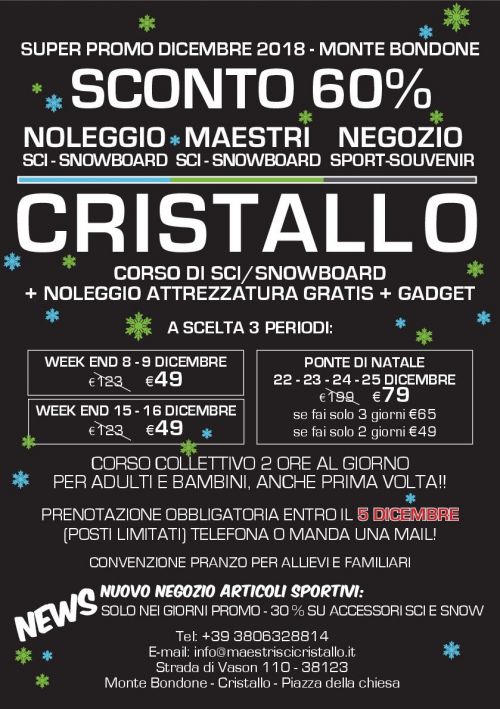 Maestri di Sci e Snowboard Cristallo, la scuola sci e noleggio con negozio sportivo annesso di Monte Bondone (Tn), lancia per il mese di dicembre una super promozione: lo sconto del 60% su un pacchetto che include il corso sci o snowboard collettivo di due ore, il noleggio dell’attrezzatura e un gadget. L'iscrizione è aperta a chiunque: adulti e bambini, sciatori e snowboarder, esperti e principianti (anche prima volta).