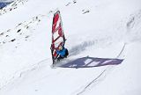 E quindi, via! Verso la neve e il dislivello per raggiungere valle: "Subito la tavola prende velocità - racconta Luca - e capisco che nelle curve in “frontside”, per scaricare la vela dalla troppa spinta, devo abbassarla parecchio, proprio come si fa quando si scende da un’onda e ci si prepare a risalire verso il picco. Fantastico, dopo qualche “turn” impacciato incomincio a prenderci gusto, le curve sull’altro lato, quelle in “backside” vanno gestite con cautela per evitare di ruotare troppo e ritrovarsi la vela piena di vento in faccia rischiando qualche “crash” incontrollato ma, tutto sommato, l’idea sembra funzionare per il meglio. Provando ad osare qualche manovra di “freestyle” cado malamente più volte, per fortuna che la neve è soffice ma di certo non è la stessa cosa che finire a gambe all’aria in acqua!