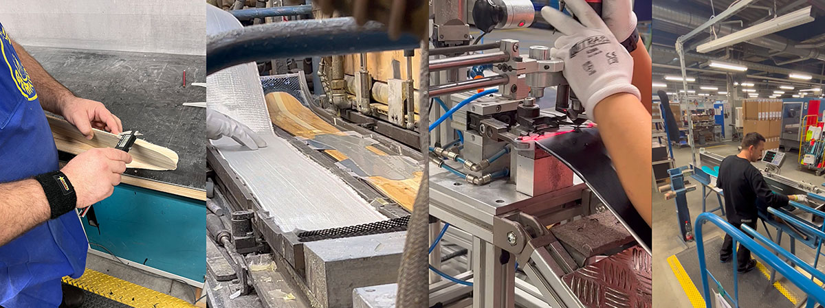 Ancora più importante è l’assemblaggio degli sci. Ogni componente viene predisposto su carrelli da 60 pz, posizionato formando una struttura a sandwich e inumidito con la resina per poi essere inserito sotto a una pressa per sci per alcune decine di minuti a temperature prossime a 100 °C e pressioni elevate.