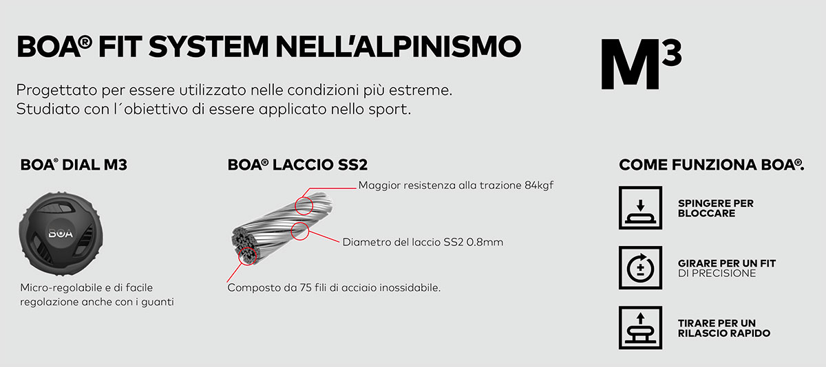 da uno spigolo all ́altro dello scarpone, offrendo cosí un'ottima performance. Ciò permette agli alpinisti di chiudere lo scarpone velocemente ed è facile da regolare durante l'attività: per esempio un fit più rilassato durante la salita e un fit più stretto in discesa, mentre si indossano i guanti o con le dita fredde.