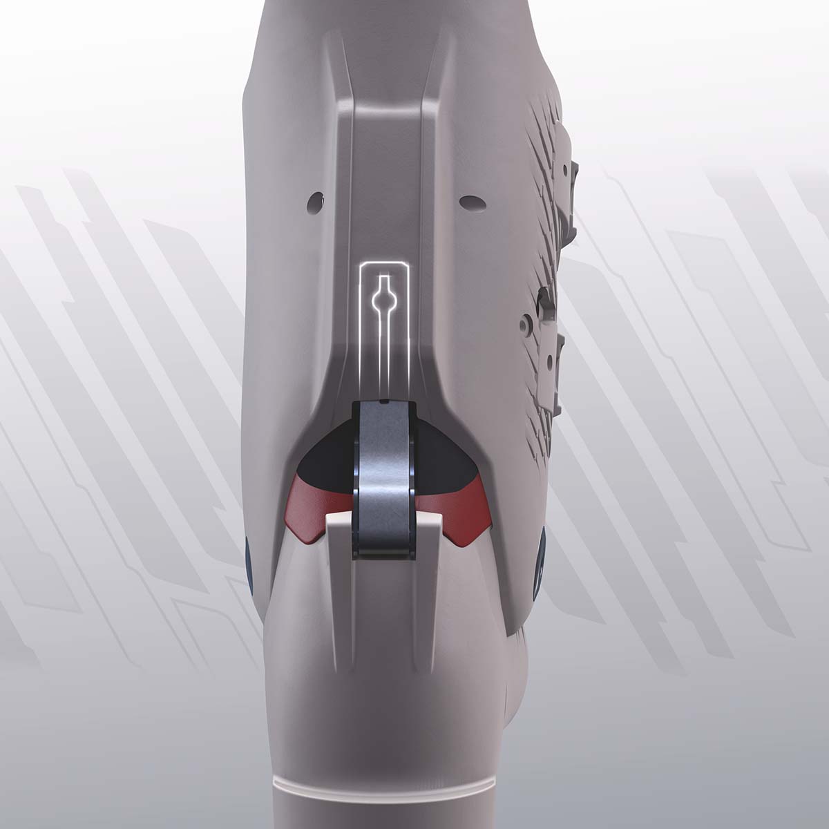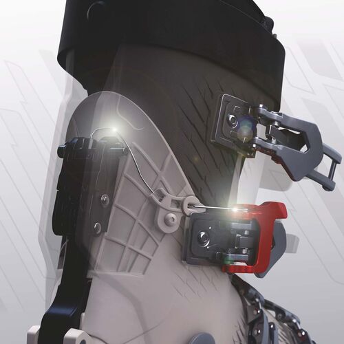 Lo stratagemma più vistoso è il gancio a doppia leva alla base del gambetto che non è solo una tradizionale leva di chiusura ma, tramite un cavo metallico, sblocca completamente il gambetto. Il design dello scafo è overlap ma l’apertura posteriore è stata ampliata e una lamina in acciaio rinforza l’azione dello spoiler e costituisce il punto di aggancio del meccanismo di sblocco del gambetto. Lo spoiler è bi-iniettato, con un materiale rigidissimo, al centro, per garantire sostegno posteriore affidabile e un materiale morbido ai lati, per sposare la forma dello scafo e favorire una calzata avvolgente.