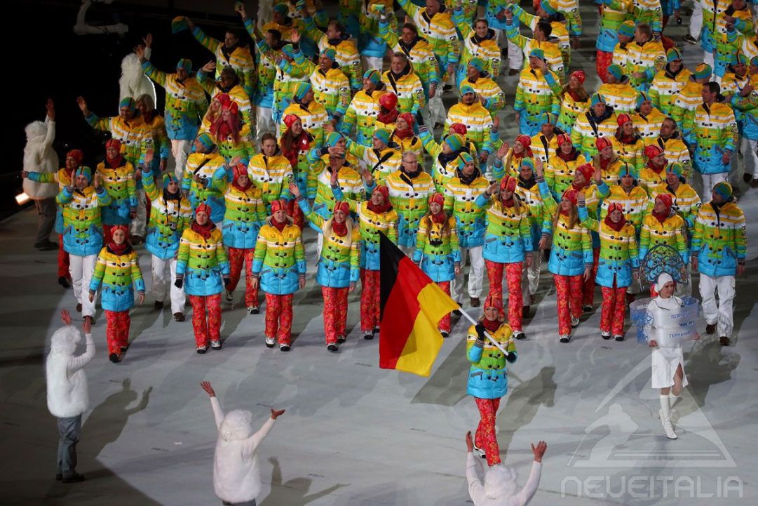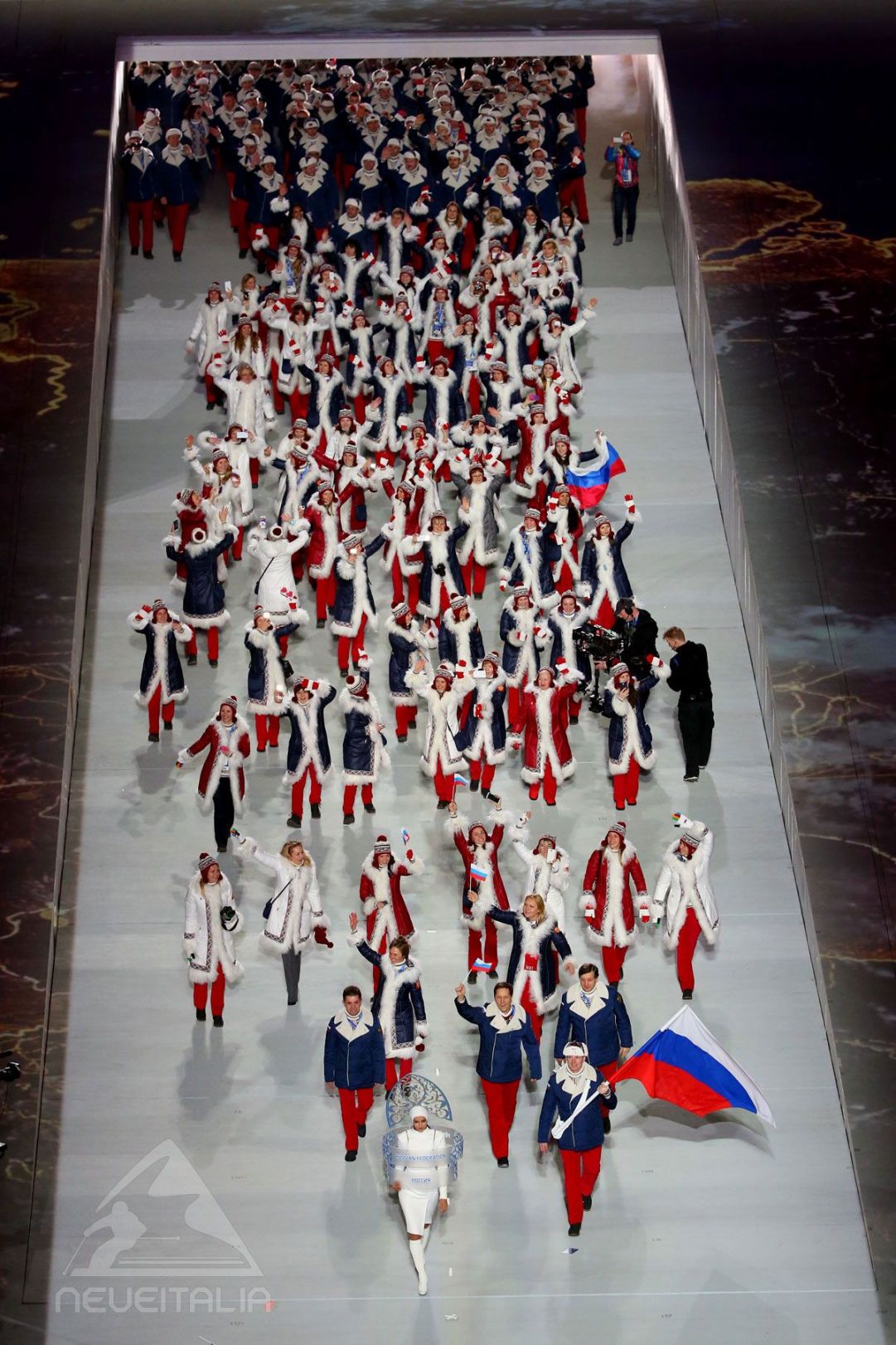 E’ la volta della sfilata delle 87 nazioni partecipanti, più 3 atleti indiani che gareggiano sotto la bandiera del CIO, la prima nazione in passerella è tradizionalmente la Grecia, l’ultima, altrettanto tradizionalmente, è la Russia padrona di casa. L’Italia è la trentaduesima a entrare nello stadio alle 20,49, le nostre 17,49, col nostro alfiere Armin Zöggeler, bella la coreografia dall’alto degli atleti che sfilano in mezzo all’immagine del proprio paese come fosse dal satellite. Arrivano le mascotte dei Giochi, un leopardo sullo snowboard, un orsetto sui pattini e un coniglietto sugli sci.