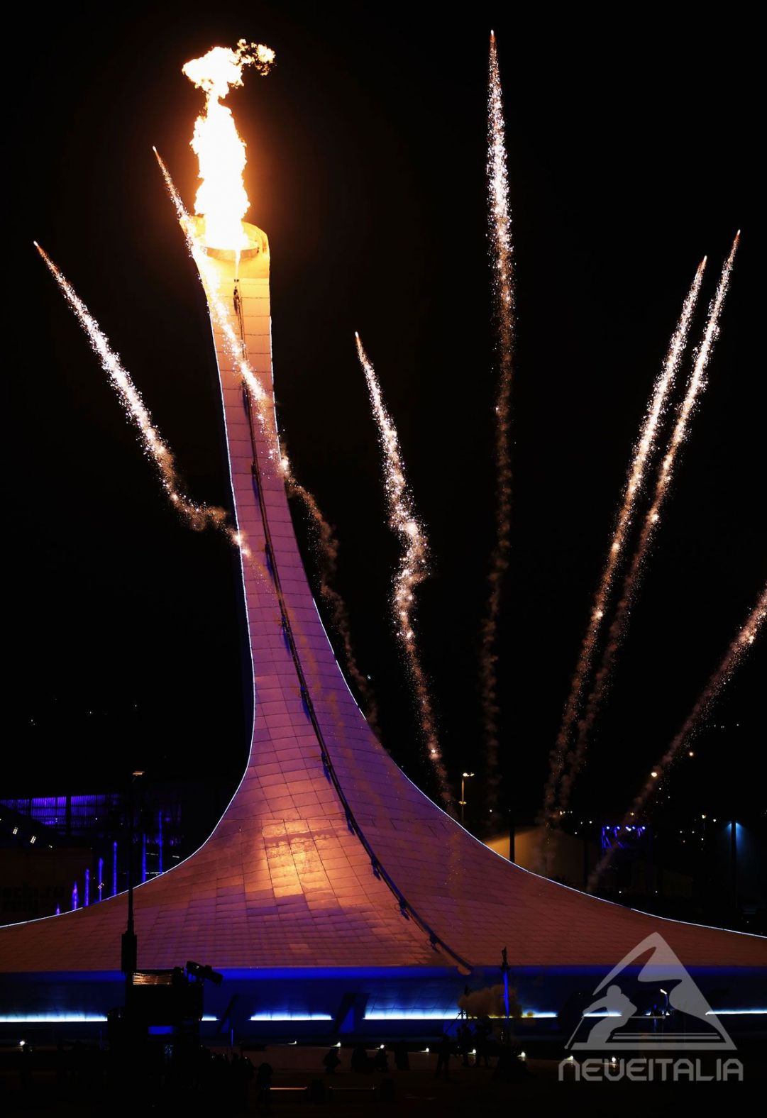 Bella la coreografia con decine di pattinatori ed effetti speciali che simboleggiano i vari sport olimpici invernali. Arriva il momento dell'accensione del tripode. La fiamma olimpica entra nello stadio portata dalla tennista Maria Sharapova, via via la torcia passa nelle mani dell'astista Elena Isinbayeva, dell'olimpionico di lotta greco-romana Alexander Karelin e della ginnasta della ritmica Alina Kabaeva, quindi passa nelle mani dell'ultimo tedoforo che... sono due, entrambi tre volte campioni olimpici invernali! Si tratta infatti di Irina Rodnina, leggendaria pattinatrice di figura nelle coppie dell'artistico, e di Vladislav Tretiak, uno dei goalie più grandi di sempre dell'hockey su ghiaccio, i due accendono insieme il braciere che risplenderà sul mondo degli sport invernali, e non solo, per i prossimi 16 giorni.