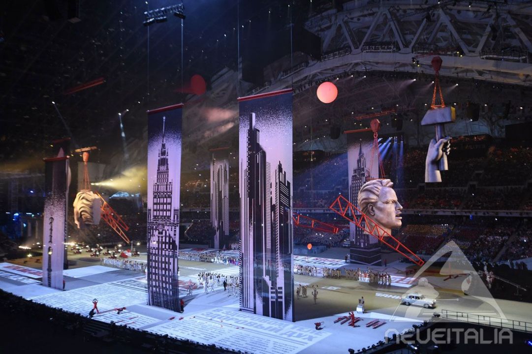 Il Fisht Olympic Stadium è il teatro del primo atto ufficiale delle ventiduesime Olimpiadi Invernali di Sochi, la cerimonia d’apertura, che inizia alle 20,14 (in assonanza con l’anno in corso) ora locale, le 17,14 ora italiana. Si comincia con la carrellata delle lettere dell’alfabeto russo, ciascuna associata a un fatto o a un personaggio della storia della Russia. Una ragazzina di 11 anni, che ha sognato queste lettere e questi fatti e personaggi viene sollevata da terra da un aquilone e vede passare idealmente tutti i paesaggi di questa immensa nazione. Piccolo intoppo quando uno dei cinque cerchi olimpici non si espande rimanendo mestamente chiuso. Segue l’inno russo con decine di persone illuminate di blu, rosso e bianco, i colori della bandiera russa.