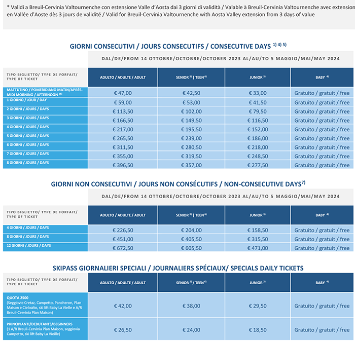 Skipass Giornalieri e pluri Cervinia Valtournenche 2023/2024
