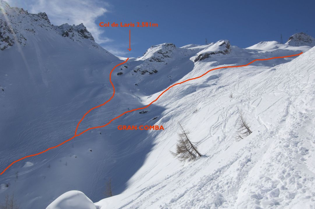 Le possibilità che si offrono ora agli amanti del fuoripista sono due: la prima riguarda la discesa diretta nella “Gran Comba” entrando nell’omonimo vallone, con la possibilità di rientrare subito dopo in pista mantenendosi sulla sinistra; la seconda invece con le pelli di foca e sci o splitboard consente, dopo poco più di un centinaio di metri di dislivello, di superare il lago Laris e raggiungere appena più in alto l’omonimo Colle a quota 2.581 metri.