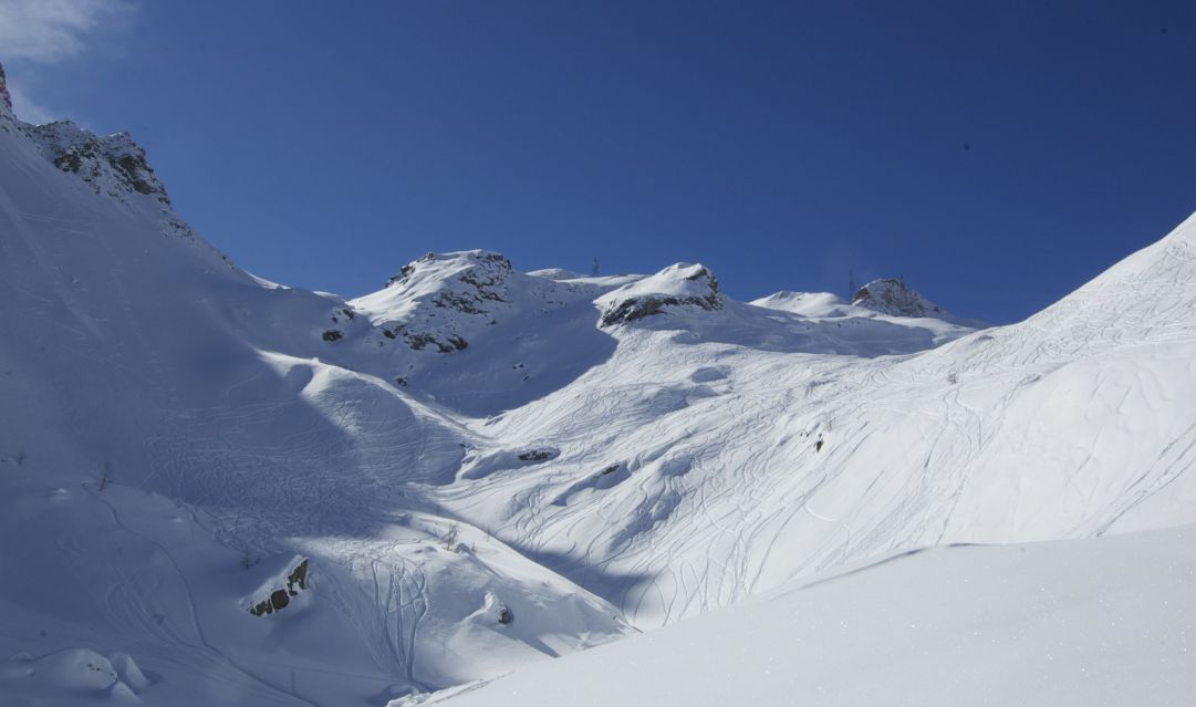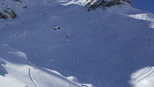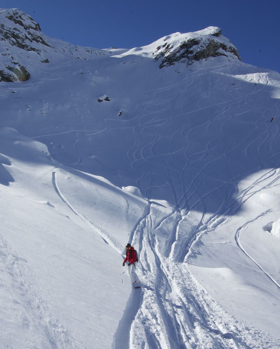 La discesa lungo il vallone sottostante potrà seguire delle linee più impegnative sulla destra che necessiteranno però della massima attenzione e monitoraggio del pendio sovrastante: la zona qui può presentare infatti delle condizioni di neve polverosa e profonda, con relativi rischi connessi.