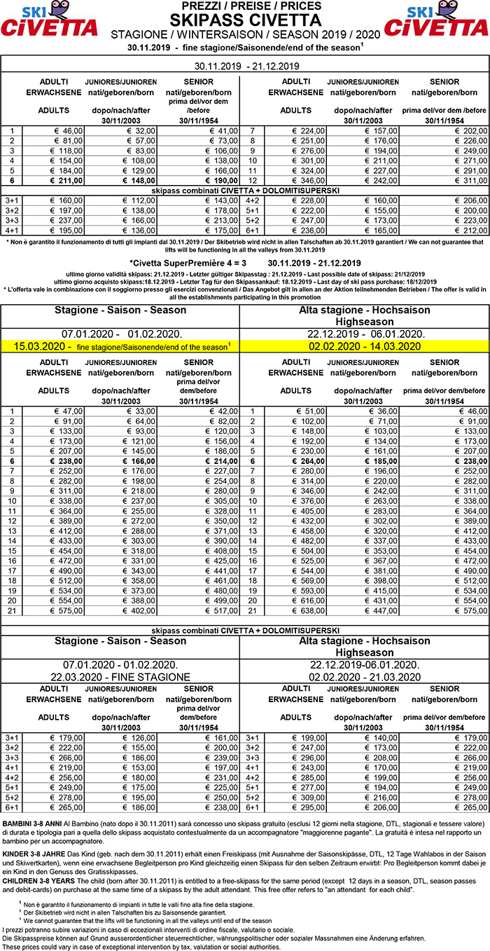Skipass Alleghe Zoldo Alto Civetta Ski 2019/2020