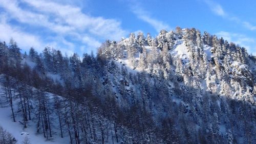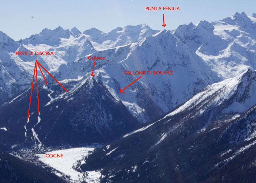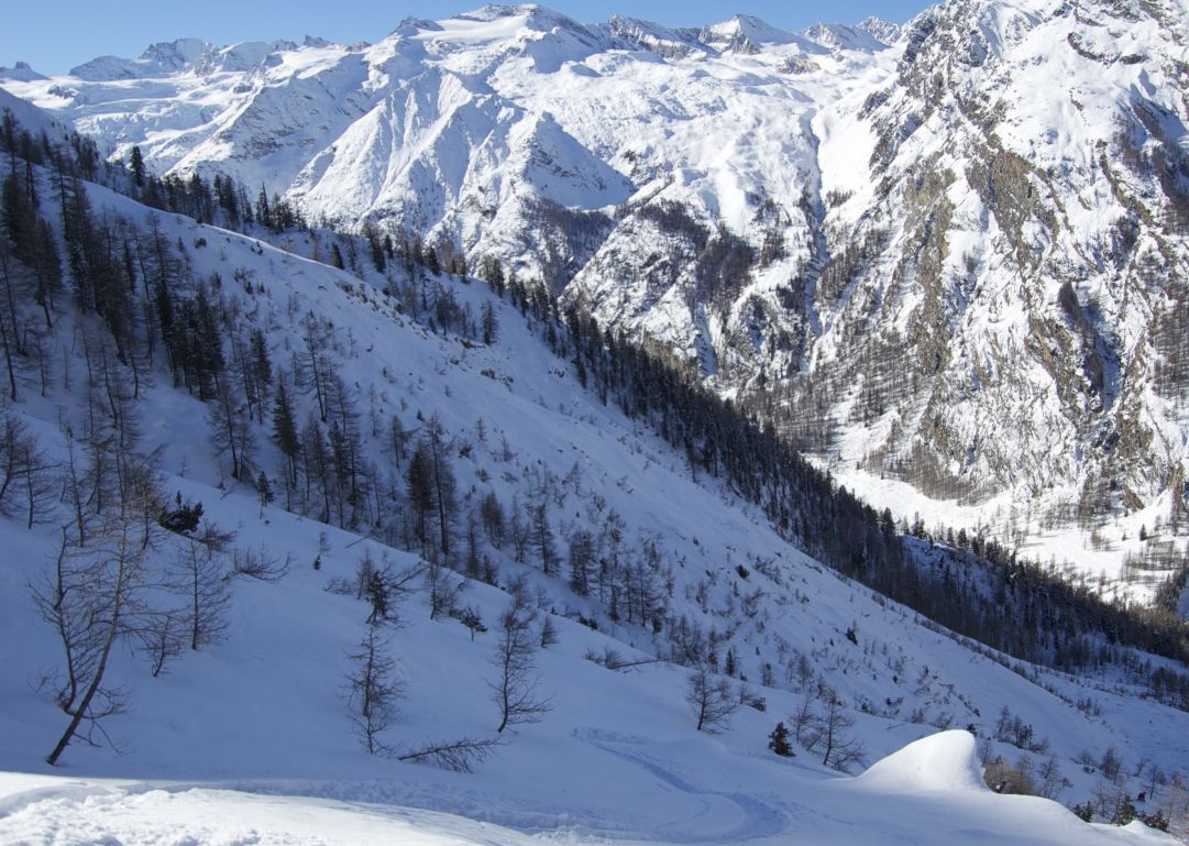 Montate le pelli si inizia il traverso a destra prestando la massima attenzione e cercando di mantenere sempre la quota di partenza. Dopo alcuni passaggi tra alberi e rocce si giunge al colletto che gira intorno al Montseuc 2.328 metri, la vetta che dà anche il nome alla telecabina: qui la vista è notevole e spazia sulla catena del Gran Paradiso 4.061metri.