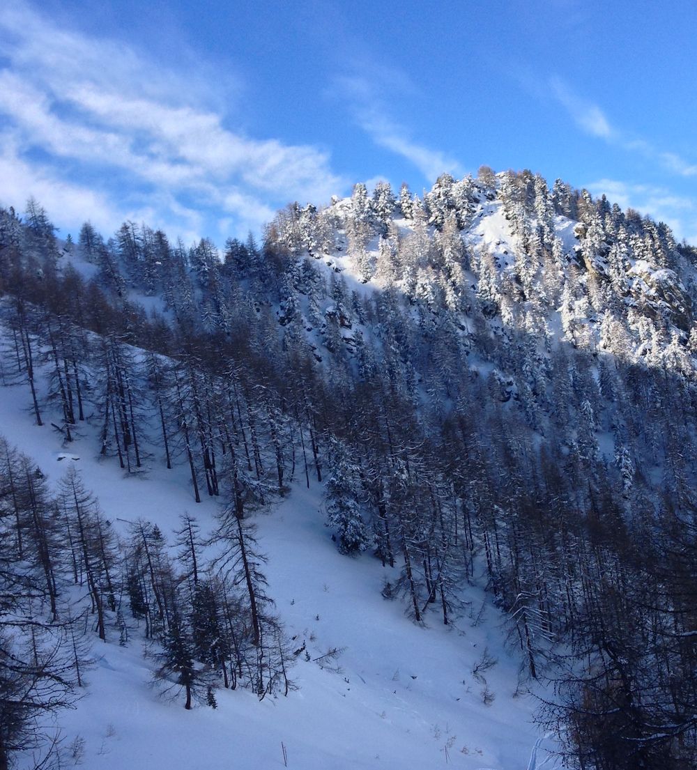 Dopo le opportune valutazioni, vista l’esposizione della zona ai piedi della Punta Fenilia di 3.053 metri che domina la valle, si inizia la discesa freeride prima in un bosco rado per giungere ad una parte più ampia e libera rientrando poi nell’ultima parte in una zona con tronchi e pietre che termina sulla strada che porta verso la splendida Valnontey.