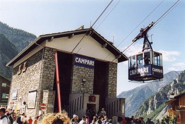 La Palud Aspettando il proprio turno per salire sul primo tratto della funivia, si osservano le cabine salire e scendere dall'affollatissimo piazzale.