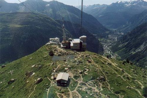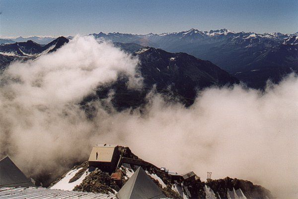 Dalla terrazza della Punta Helbronner Guardando verso il basso sul versante italiano si vedono i due rifugi Torino, il Vecchio in basso e il Nuovo più in alto, con la tremenda scala coperta a doppia pendenza che li collega.