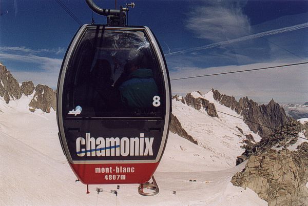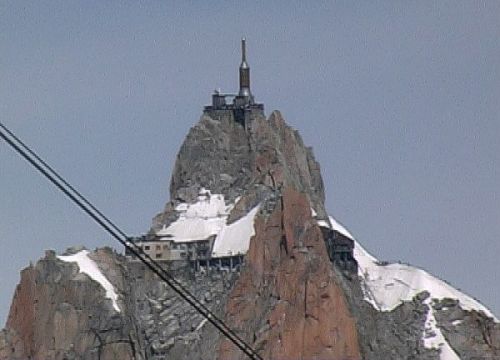 Gros Rognon Prima di risalire sulla funivia, ammiriamo in direzione della Francia il percorso, col pilone sospeso, il passaggio sul Gros Rognon (con cambiamento del cavo portante nonchè leggera deviazione) e in fondo la sagoma dell'Aiguille du Midi.