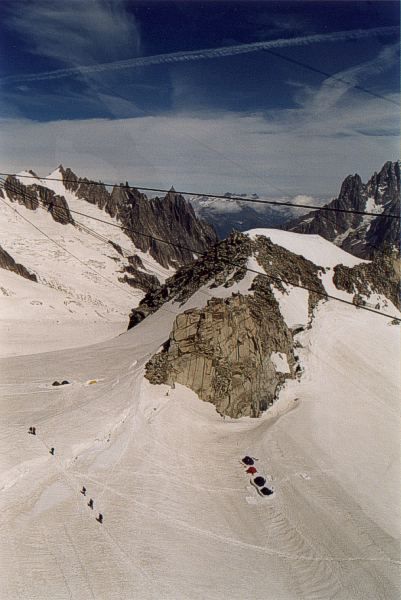 Cordate verso Aiguille du Midi Appena prima del pilone sospeso (si vedono chiaramente i tre robusti cavi che lo tengono in posizione) si vedono meglio le cordate che si dirigono in direzione dell'Aiguille du Midi e il gruppo di tende.