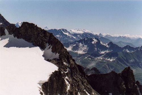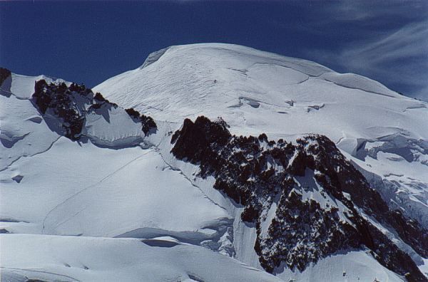 cima del bianco Un'immagine ravvicinata (con un 200 mm.) della cima. Piccolissimi, parecchi alpinisti salgono a destra del Mont Maudit (4465 m.) verso il Bianco. Si vede il loro percorso zigzagare fino alla cima.