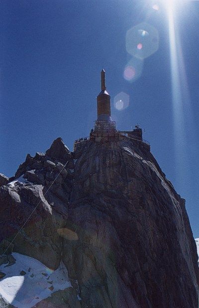Cordate verso l'Auguille du midi Nelle belle giornate estive c'è un continuo andare e venire di cordate all'Aiguille du Midi. Da questo punto l'accesso alla stazione, quasi tutta scavata nella roccia, è attraverso una galleria di ghiaccio.