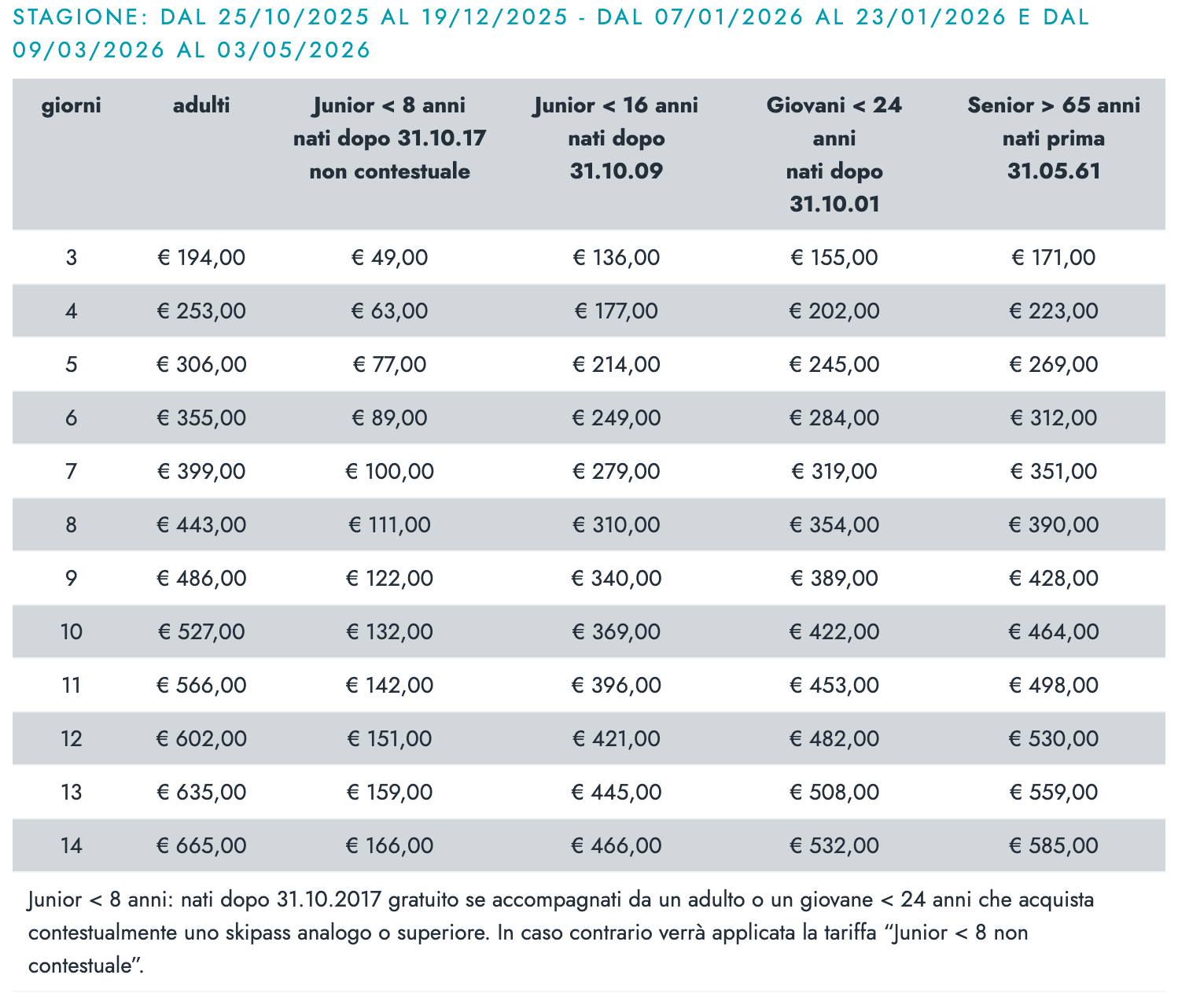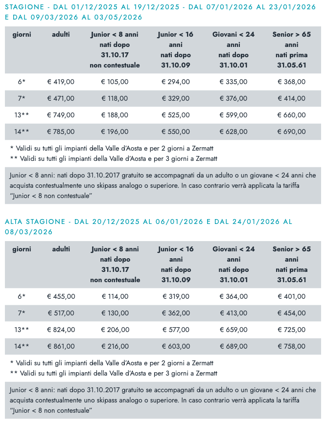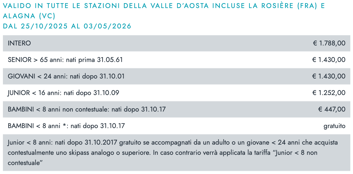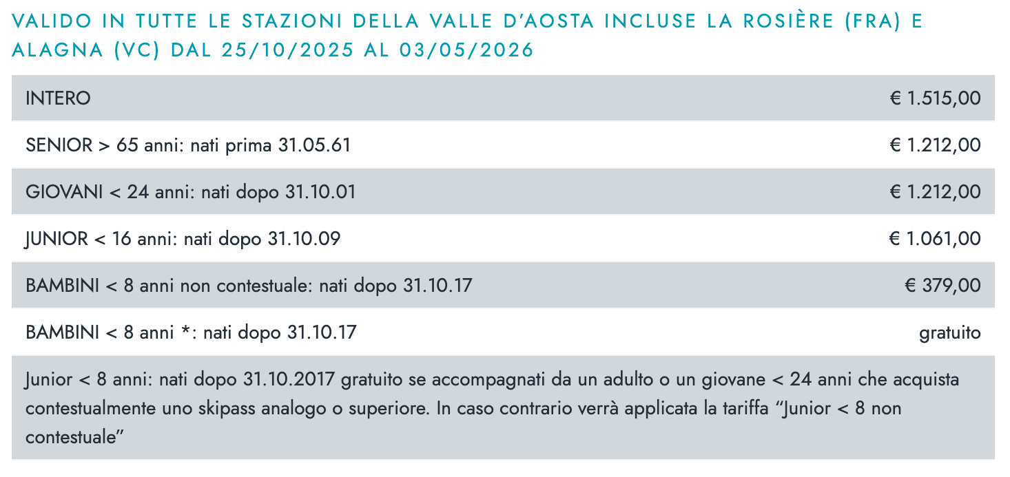 Skipass Plurigiornaliero Stagione Valle dAosta 2025/26