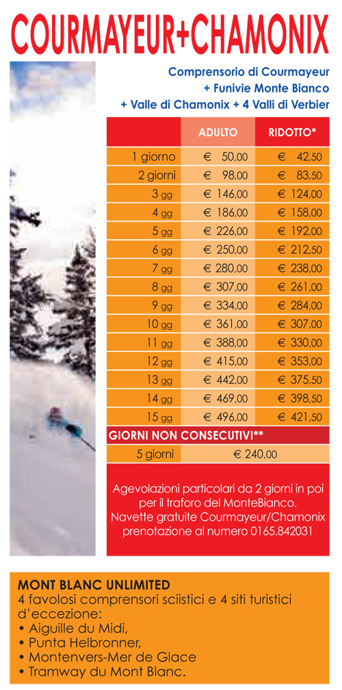 - NB : - accesso gratuito a Chamonix(*), alle Funivie Monte Bianco(*) e sconti sul passaggio traforo del Monte Bianco (*)