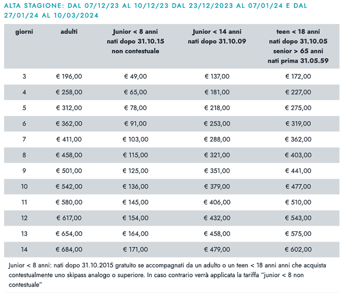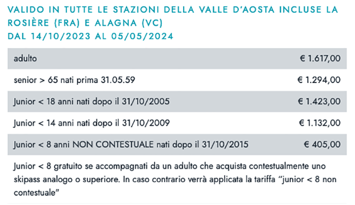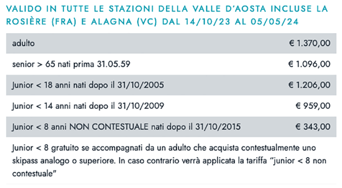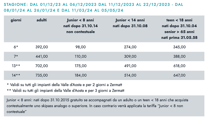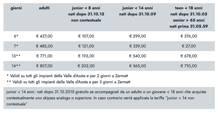 Skipass plurigiornaliero Valle Aosta - Alta Stagione