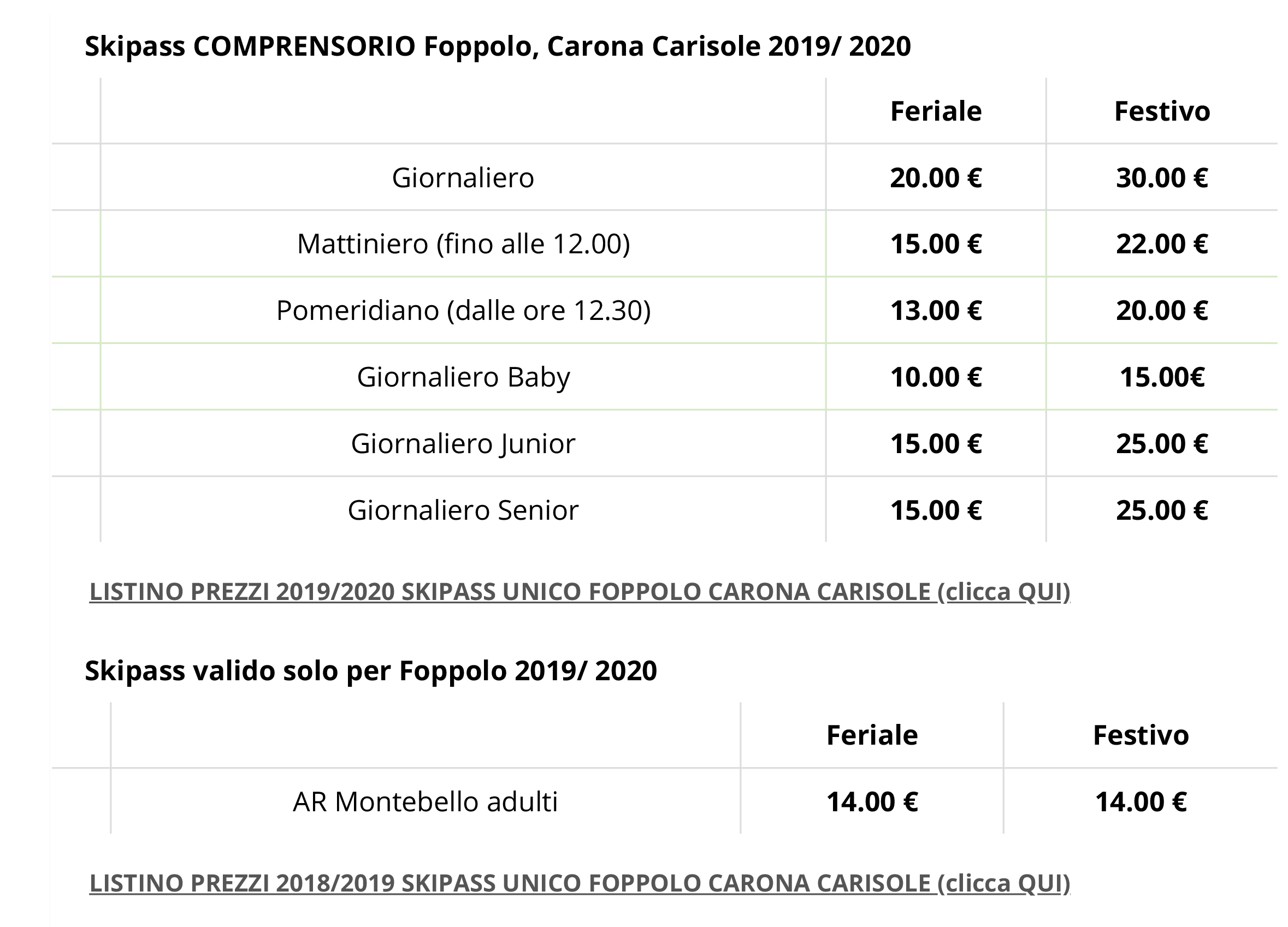 Prezzi Skipass
