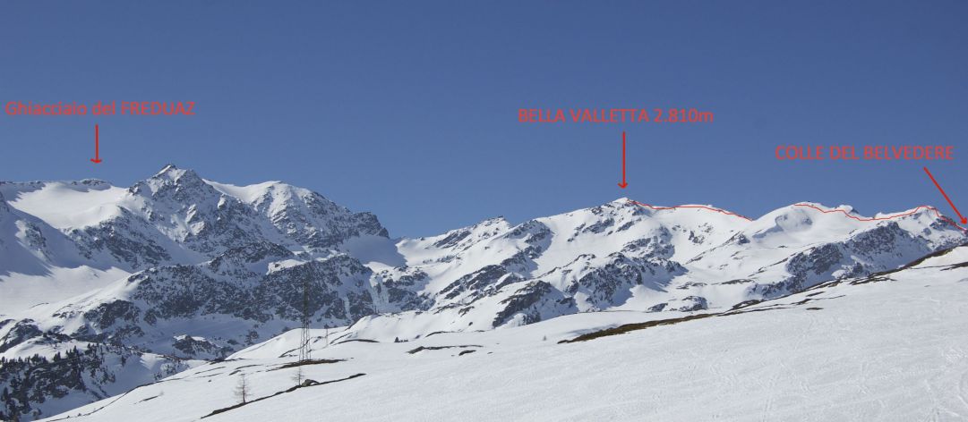 La nostra gita parte dal Colle del Belvedere a quota 2.588 metri sul confine italo-francese, di fronte al Monte Belvedere 2.641 metri e zona di arrivo della sciovia francese Bellecombe II. Nella prima parte si procede a piedi lungo uno spartiacque naturale (nel caso anche con ramponi) e arrivati al primo step in quota si potrà procedere mantenendo la linea delle rocce che coincide col confine transfrontaliero.