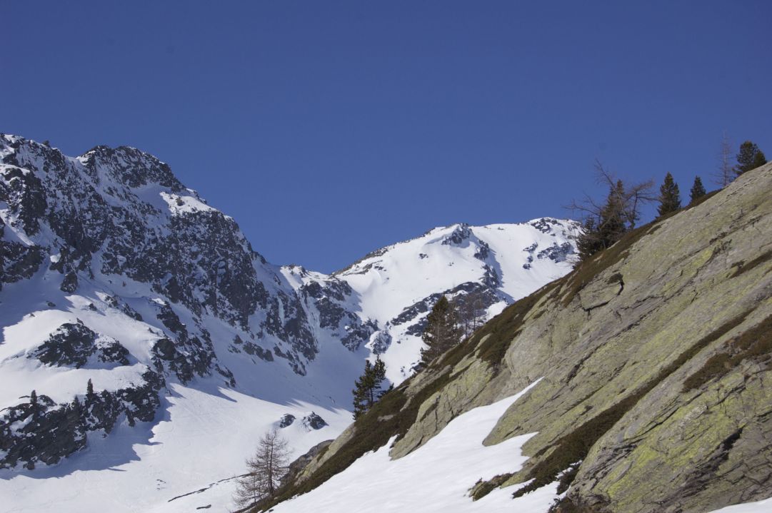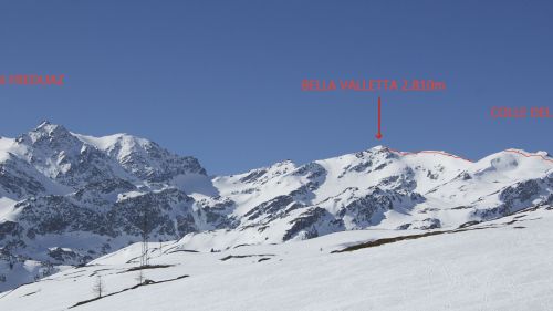 Superato il primo promontorio sulla destra, da qui in base alle condizioni si potrà procedere anche con le pelli iniziando a pregustare la meta, Bella Valletta, con sulla destra in lontananza il Mont Valaisan 2.892m.