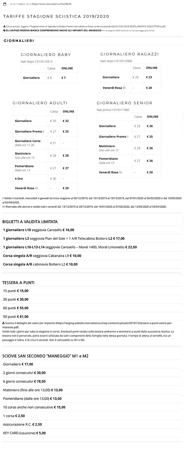 Prezzi Skipass