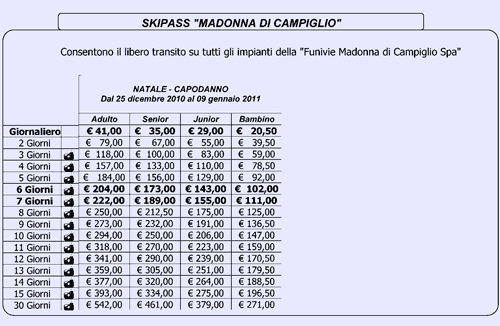 Tariffe skipass impianti Madonna di Campiglio 2010/2011