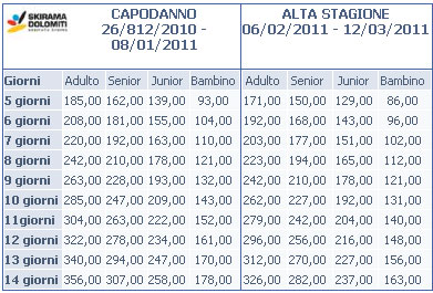 PREZZI SKIPASS SKIRAMA 2010-2011