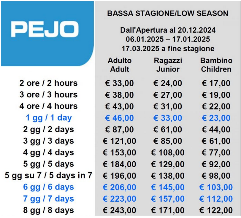 Skipass Bassa Stagione Pejo Val di Sole 2024/2025