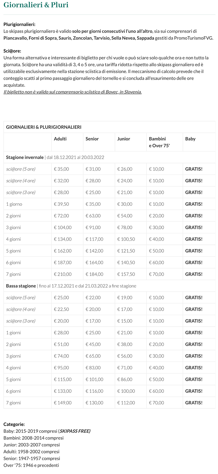 Prezzi Skipass