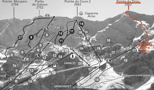 La nostra discesa può seguire tranquillamente il vallone di salita riportandoci verso la seggiovia Grimondet dove si può proseguire in pista oppure ancora in fuoripista sulla sinistra in un bosco con varianti interessanti. Altra variante può essere, verso 3/4 della discesa, la linea lungo la cresta spartiacque girando poi a destra e raggiungendo la pista tra il Grimondet e il Couis 2, lasciando alcune tracce ben visibili dall’intero comprensorio: qui però occorre prestare la massima attenzione e