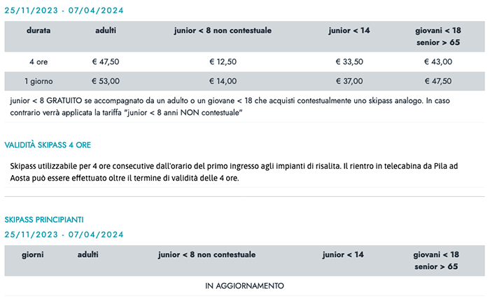 Skipass a ore e giornalieri Pila